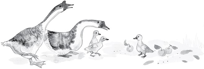 Вдруг гусь берёт клювом эту корку и идёт к луже.