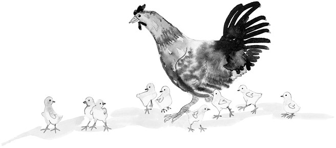 А кура как ни в чём не бывало собрала всех своих цыплят, пересчитала их и снова стала прогуливаться по двору.