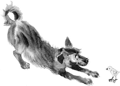 Собака от удивления даже рот раскрыла. И цыплёнка выпустила. И тот сразу поскорей убежал. А собака посмотрела, кто её клюнул в глаз. И, увидя куру, рассердилась и бросилась на неё. Но тут подбежал хозяин, схватил собаку за ошейник и увёл её с собой.