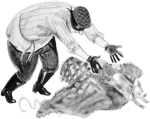 – Ах, какая свинья этот хитрый поросёнок. Наверное, он нарочно притворился мёртвым, чтоб я его выпустил. Или, может быть, он от страха упал в обморок.