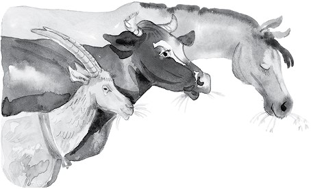 Кошки пьют молоко и едят птичек. Коровы кушают траву. Быки тоже жрут траву и бодают людей. Тигры, эти нахальные животные, питаются сырым мясом. Обезьяны кушают орешки и яблоки. Куры клюют крошки и разный мусор.
