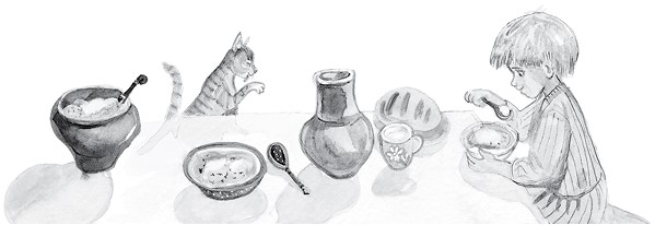 Кошка Бубенчик долго глядела со своего шкафа, как Павлик кушает. Потом не вытерпела и тоже решила немножко покушать.