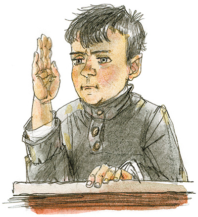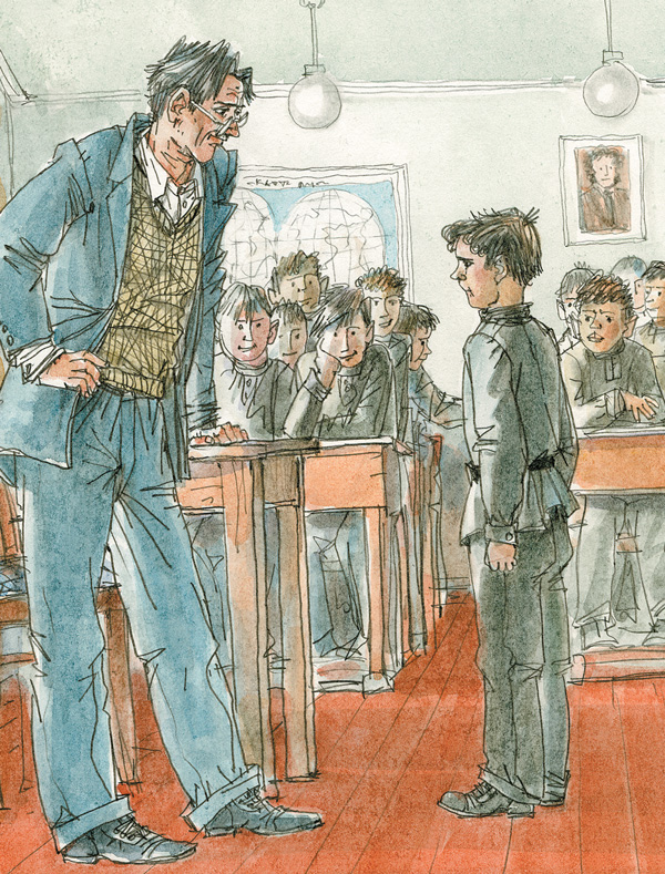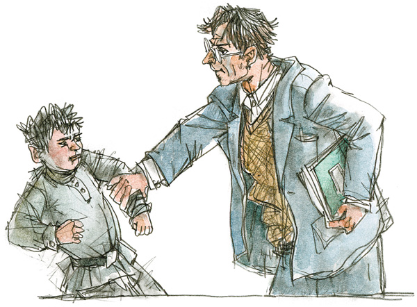 – Что ты ска-за́л? – гро́з-но кри-чи́т у-чи́-тель. И, схва-ти́в ме-ня́ за́ ру-ку, тя́-нет на-ве́рх, в ди-ре́к-тор-ску-ю. Но вдруг от-пус-ка́-ет ме-ня́. Го-во-ри́т: