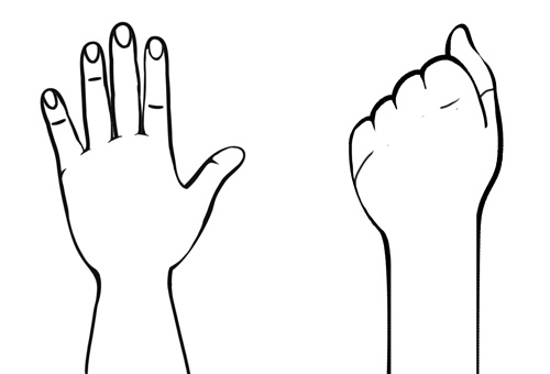 Положи руки на стол: левую ладонью, правую сожми в кулак. Быстро сжимай и разжимай руки по очереди 10 раз. Перекрести руки и повтори упражнение.