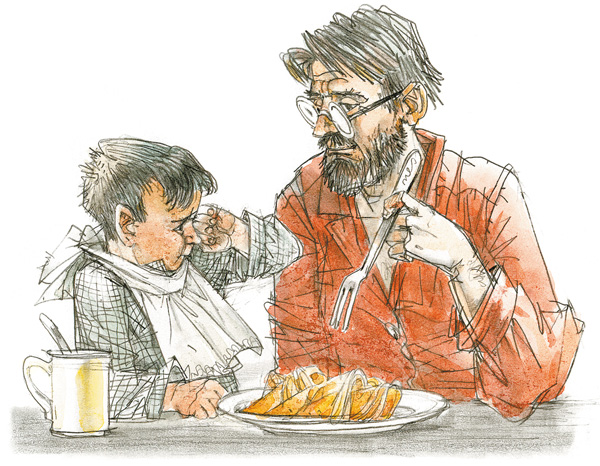 Вдруг о-те́ц бе-рёт мо-ю́ та-ре́л-ку и на-чи-на́-ет ку́-шать мо-и́ бли-ны́. Я ре-ву́.