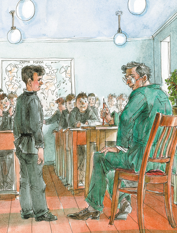 В кла́с-се вод-во-ря́-е-тся по́л-на-я ти-ши-на́. Я бор-мо-чу́ за-да́-ни-е, но ду́-ма-ю о дру-го́м. Я ду́-ма-ю об э́-том у-чи́-те-ле, ко-то́-рый не по-жа́-ло-вал-ся ди-ре́к-то-ру и вы́-звал ме-ня́ не так, как ра́нь-ше. Я смот-рю́ на не-го́, и на мо-и́х гла-за́х по-яв-ля́-ю-тся слё- зы.