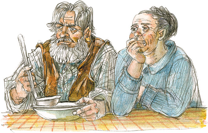 Дедушка держит разливательную ложку над моей тарелкой. Одну каплю супа он капает в мою тарелку.