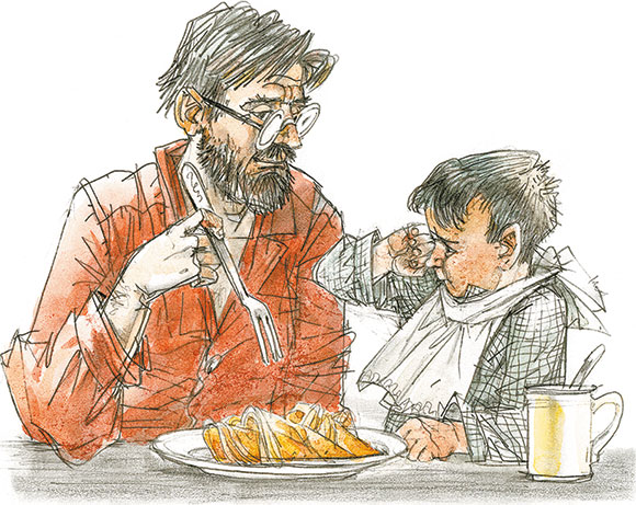 Вдруг отец берёт мою тарелку и начинает кушать мои блины. Я реву.