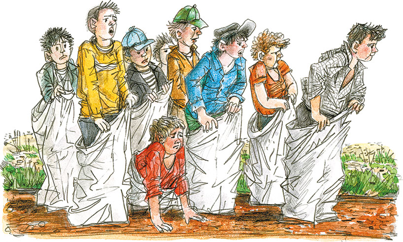 Вот мешки завязаны. И дети в мешках поставлены на белую черту.