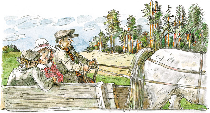 Мы сидим в телеге. Рыжеватая крестьянская лошадёнка бойко бежит по пыльной дороге.