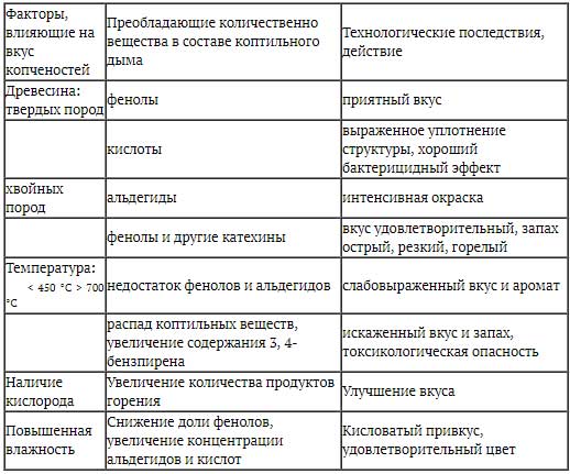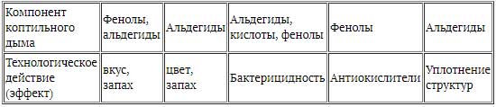 В таблице 1 представлены данные, характеризующие влияние отдельных компонентов коптильного дыма на технологические показатели и свойства готовой продукции.