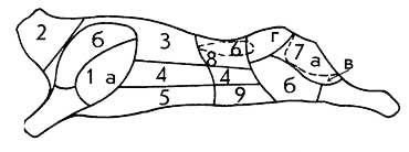 Рис. 1. Схема разделки говяжьей туши: 1 – лопатка: а) – плечевая часть, б – заплечная часть; 2 – шея, 3 – толстый край (спинная часть); 4 – покромка; 5 – грудинка, 6 – вырезка, 7 – задняя нога: а) внутренняя часть, б) – боковая часть, в) – наружная часть, г) – верхняя часть, 8 – тонкий край поясничная часть), 9 – пашина.