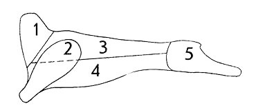 Рис. 2. Схема разделки бараньей туши: 1 – шея, 2 – лопатка (передняя нога), 3 – корейка, 4 – грудинка, 5 – окорок (задняя нога).