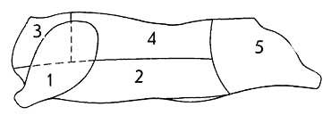 Рис. 3. Схема разделки свиной туши: 1 – лопатки (передняя нога), 2 – грудинка, 3 – шея, 4 – корейка, 5 – окорок (задняя нога)