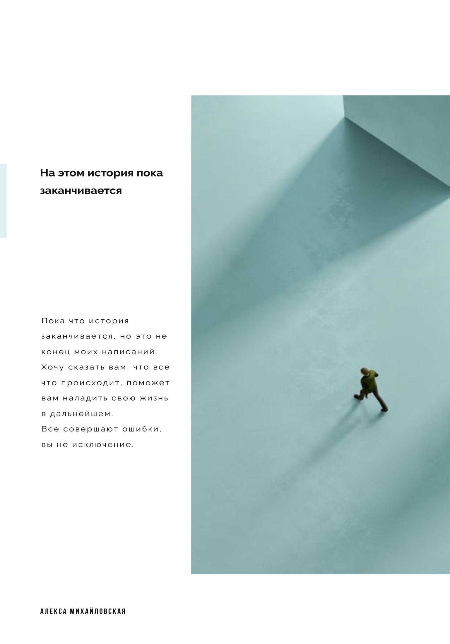 Никки пытался тоже помочь , но как и следует ожидать, я закрылась от всего мира, и погрузилась в свои мысли, о том, что я не такой хороший человек, что она портит всем жизнь. Я не выдержала, удалила все социальные сети. На протяжении недели я была в хлам, и никто ничего мне не сказал. А после я буду учиться не открывать себя людям, не доверять им, и не быть наивной, как все мне твердят.