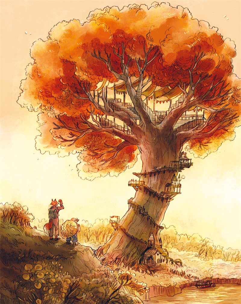После часа быстрой ходьбы друзья, наконец, увидели корни могучего дуба, где музыканты уже разложили свои инструменты и теперь прилаживали их на спины с помощью крепких верёвок. Главная особенность заключалась в том, что концерт проходил… на верхушке дуба. Если верить табличке, установленной у его основания, исполинскому дереву было более тысячи лет, окружность его ствола составляла целых пятьдесят метров, а концертный зал находился на высоте двухсот семидесяти двух метров над землёй. Чтобы добраться до зала и насладиться музыкой, слушателям предстояло преодолеть тысячу четыреста сорок три ступеньки. «Для тех, кто любит музыку, это пустяк!» – говорил Филин Гедеон Дубравный, когда его спрашивали, действительно ли он считает это место самым подходящим для концертного зала. На протяжении всего пути наверх на ветках были установлены разноцветные киоски, напоминавшие больших неподвижных птиц; в них слушателям предлагали свежий лимонад, толчёный лёд с кленовым сиропом и невероятно питательные блины из желудёвой муки. Там же можно было купить миниатюрные изображения дуба, деревянные статуэтки, изображавшие Великого и Талантливого Гедеона (именно под таким названием они были зарегистрированы в торговой палате леса), шёлковые шарфы для защиты от холода и солнечных ожогов, а также маленькие музыкальные инструменты, которые могли заинтересовать детишек. Наконец, легенда гласила, что на верхушке можно было купить самые вкусные жареные каштаны. Они продавались в упаковках из дубовых листьев, чтобы посетители не испачкали пальцы, ведь прежде чем опустить каштаны в кипящее масло, в котором наилучшим образом раскрывался их осенний вкус (пусть даже дело происходило весной!), их обваливали в сахаре, ежевичном конфитюре и каштановой пудре – это было невероятно вкусно!
