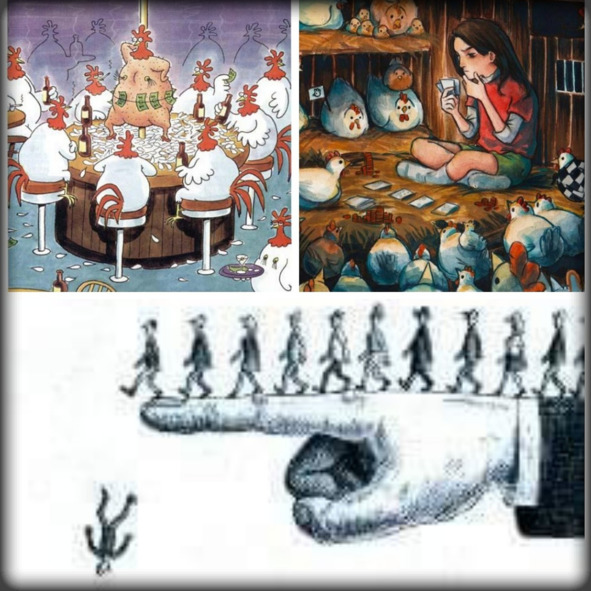 Курам же больше всех «Монополия» запонравилась – Игра специальная такая, где надо было денег да побольше собирать и насобирать, собственность покупать и перекупать, страны создавать и разрушать. Покупали и перекупали, страны строили и разрушали, покупали и перекупали, страны строили и разрушали… Чело-веЧки же наши по делам своим ненадолго в соседний город поулетали… И вдруг… Куры же все дружно И решили, что они хозяева Голубой планеты той, на которой жили наши чело-веЧки, построившие для них курятник, и в Игры разные наУчившие их играться… Мораль сей скаЗки-басни такова: «Пока не увидишь Мир таким, каким он есть на самом деле – не узнаешь и не поймёшь о том – кто ж Ты в этом Мире на самом деле»… Когда вернулись чело-веЧки наши – не понравились им куры те с куриными мозгами И, чело-веЧками возомнившими себя. И решили сМодернизировать их немного: 1. Вакцинировать (чтобы ДНК их изменить). 2. Чипировать (чтобы контролировать их мысли редко иногда некуриные и прирост на планете Голубой). Но куры те были заняты совсем другой игрой своей любимой (всё законы новые писали и писали и депутатов в свой парламент куриный избирали, всё новые законы писали и писали и депутатов в свой парламент куриный избирали, пели и танцевали и в искусства разные играли, одним словом – во Власть и в Чело-веЧков всё играли и играли) … И даже не заметили, как их красиво и грамотно того…