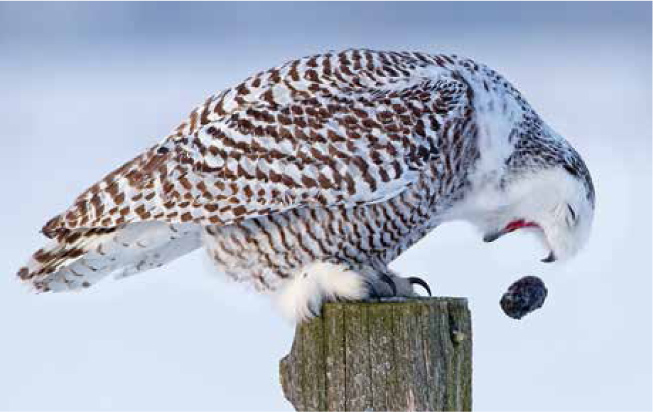 A Snowy Owl coughs up a pellet containing the indigestible parts of its prey.