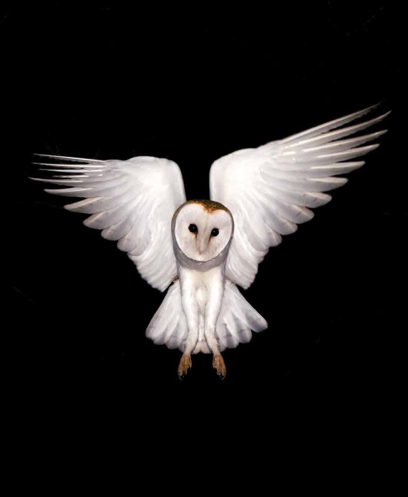 A Barn Owl captured in a seemingly angelic pose as it approaches the nest.
