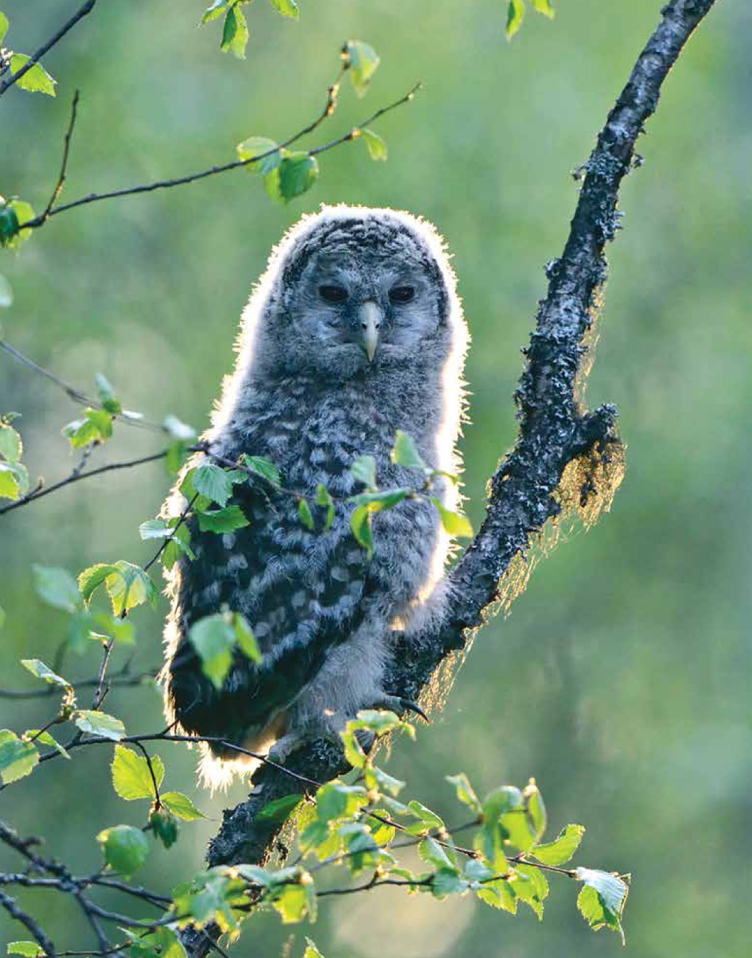 A fledgling Ural Owl still in its downy juvenile plumage.
