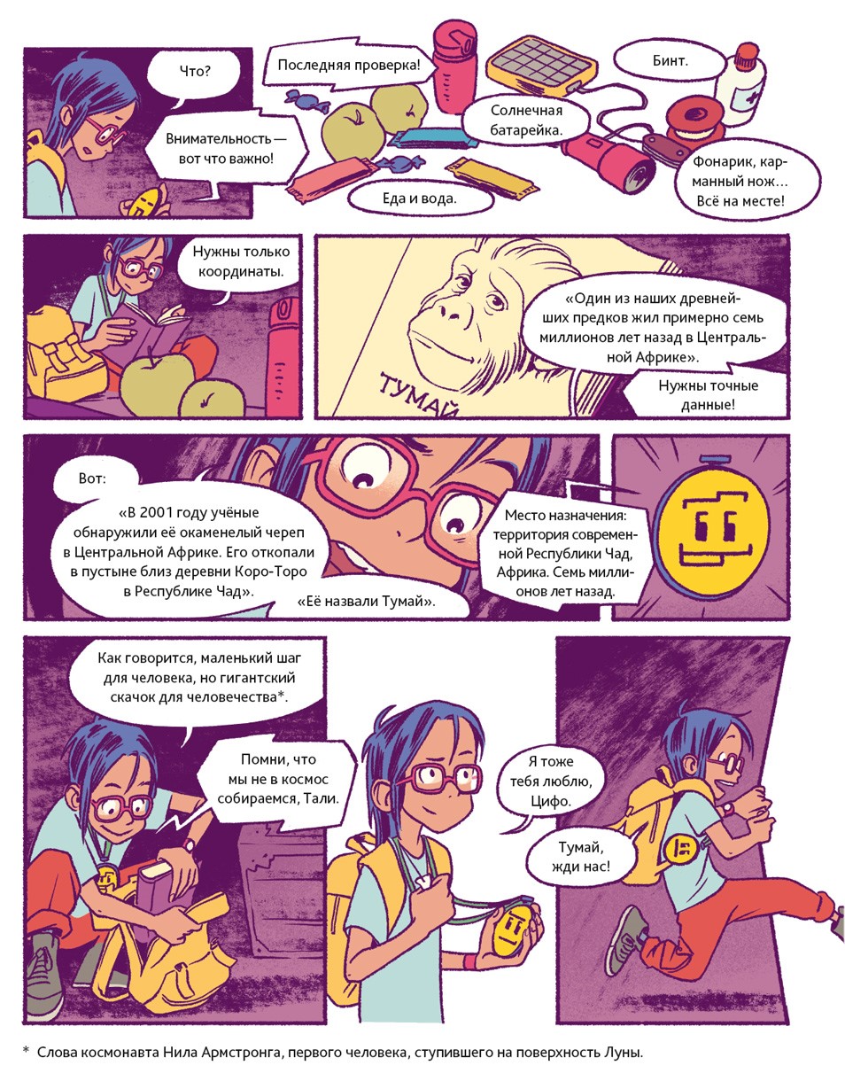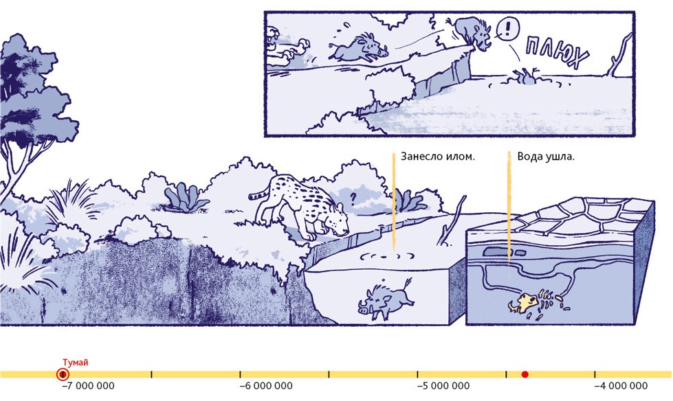 Процесс становления людей состоял из бесчисленного количества крошечных шажков в течение чрезвычайно долгого времени. Поэтому нельзя просто сказать: «Хоп! Вот теперь это совершенно точно люди». Тали навестила Тумай, потому что в ней проявляется, вероятно, первейшая и важнейшая человеческая особенность: скорее всего, Тумай частенько ходила на двух ногах. Но для формирования идеальной походки понадобилось ещё несколько миллионов лет. В течение этого времени скелет постепенно менялся, происходили значительные изменения в строении черепа, таза, ног и рук, кистей и ступней.