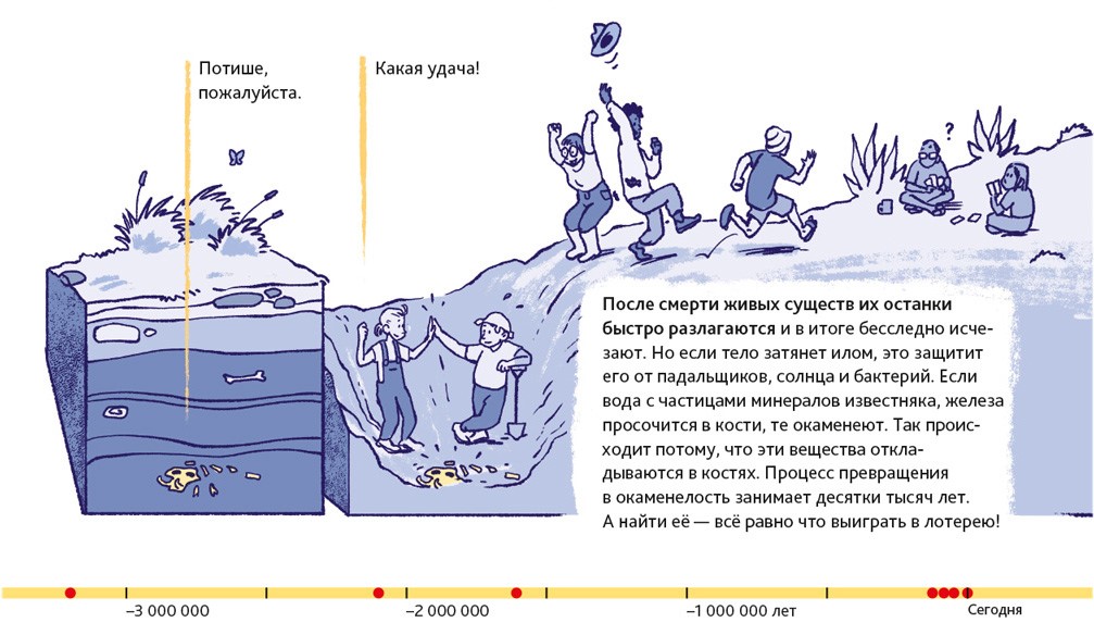 Находки из доисторических времён позволяют нам предположить, какой была жизнь первобытных людей и какая природа их окружала. Археологи ищут кости, зубы или остатки растений, которым много миллионов лет. Их называют окаменелостями. Только ряд удачных совпадений может привести к тому, что останки животного или растения станут окаменелостью.