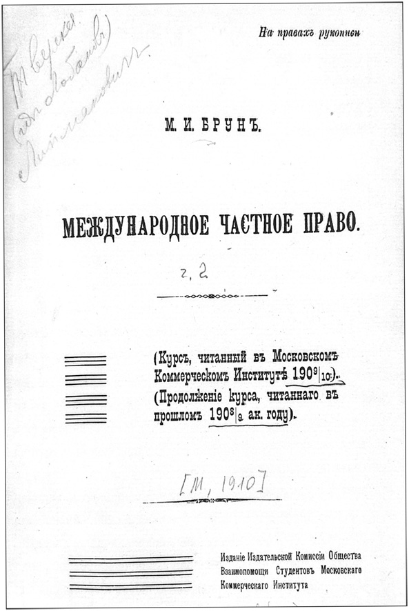 В качестве заключительного замечания отметим, что лекции М.И. Бруна представляют собой наиболее полный курс международного частного права опубликованный до 1917 г. Данный курс основан на обширном анализе иностранной и отечественной доктрины. Вне всякого сомнения, обращение к данной работе будет способствовать пониманию тех фундаментальных положений, которые лежат в основе современного российского регулирования международного частного права.