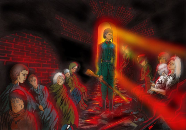 Командир следовал за Катей вниз. Зина сопроводила обоих взглядом, не отрываясь от раненых, помогая им как можно, и унимая их страдания. Дальше по этому коридору был завал. Его уже расчистили и за ним, оказалось людей куда больше, чем можно было рассчитывать. Катя их уже видела. Там были и солдаты, половина из которых истекли кровью и умерли, будто уснули. Буквально рядом с их телами были женщины с детьми. Пожилые люди и подростки, которым еще слишком рано идти в бой. Их лица…. Они молили о помощи и спасении. Их глаза, были полны слез, но они не могли течь по щекам, ведь воды уже нет. Все вокруг озарял красный, тусклый свет, который кое-как пробивался издалека коридора. Детский плачь, оханье, визг и стоны. Это место было адом, а все люди, неповинно заточенные в нем, были подобны мученикам, которые расплачиваются за неназванные грехи. Багровый кирпич, багровый свет и нет солнца.