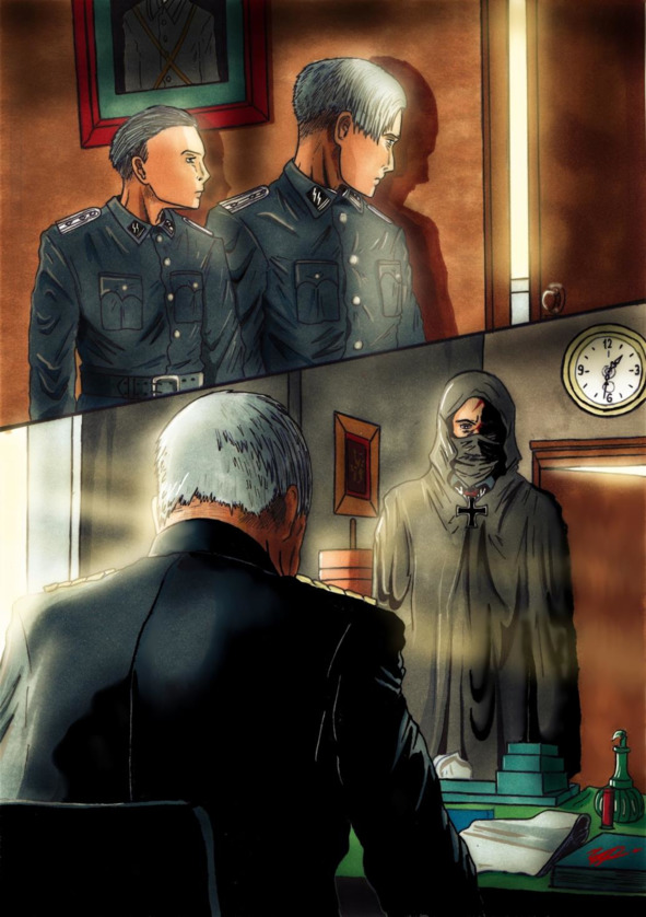 Толком, не попрощавшись, наставник просто направился к дверям. В это время Хартман и Эрвин поспешили удалиться, чтобы их не заметили. Наставник вышел в коридор и направился к выходу из здания, где его уже ждал целый эскорт из элитных солдат и офицеров СС. Командиры подошли к окну, чтобы увидеть, как важная шишка покидает базу. Они заметили, что наставник озирается по сторонам, будто чувствует неладное, но все же садиться в красивый, черный Хорьх и уезжает.