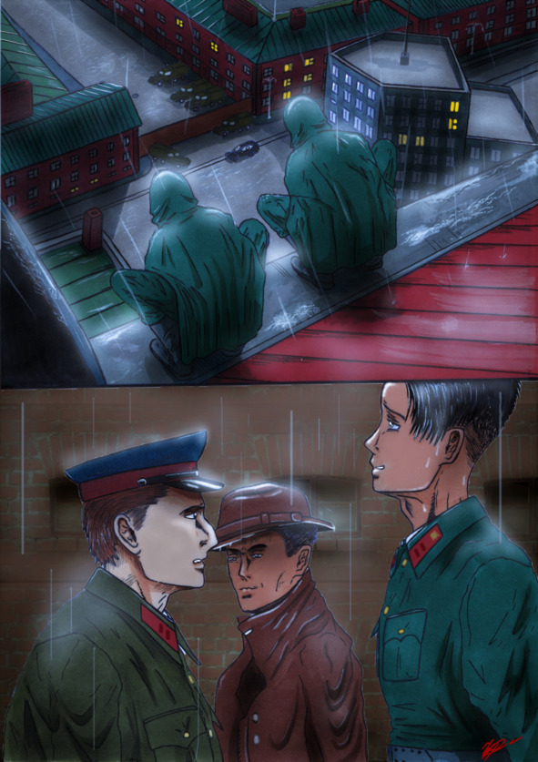 А дождь все не прекращался. И вот, наконец, на горизонте, возле одного из домов появился мужчина. Это был странный товарищ, в гражданской одежде. На нем была стильная шляпа и темно-коричневый кожаный плащ с высоко поднятым воротником. Его лицо сверху было плохо видно, учитывая еще и то, что этот человек не самого высокого роста. Вместе с ним из-з угла вышли двое солдат НКВД с оружием в руках. Это были лишь мелкие пешки, в звании заместителя политрука и сам политрук. Они встали перед машиной в шести метрах от нее и стали ждать. Вскоре, им навстречу, из машины в дождь, выбрался и комиссар. Вместе с ним вышел и Блюхер.