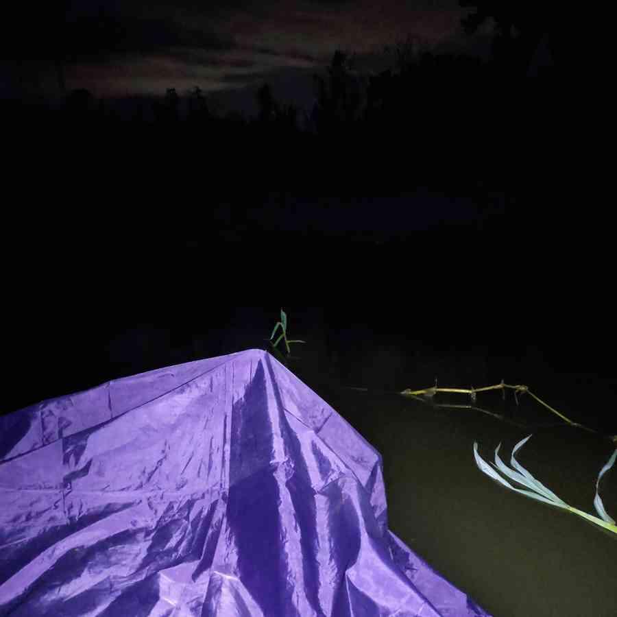 Не успело стемнеть, как я решил подыскать место для ночлега, чтобы не лазить по грязи (как вчера). Сухой берег отыскать так и не удалось. Причалил прямо к зарослям у затопленного леса, куда были нанесены брёвна и различные прутья.