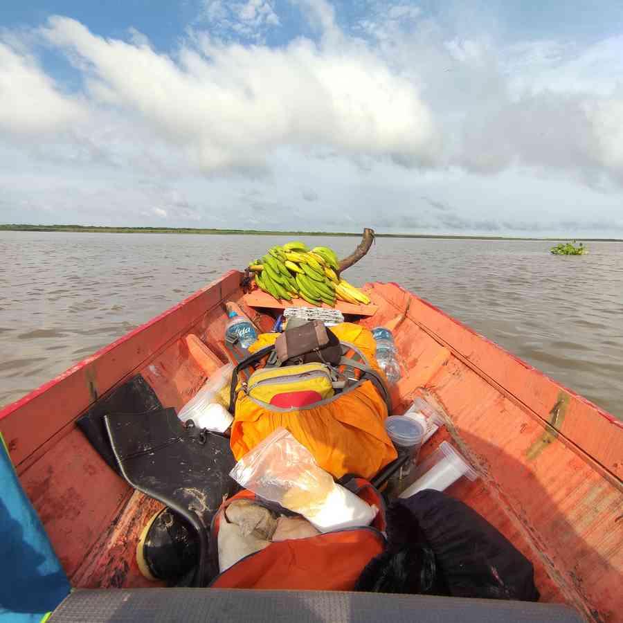 Прибираюсь на лодке, вычёрпываю воду, готовлю завтрак – фаринью с бананом и сахаром. Это довольно вкусно, но жиров будет не хватать, если питаться так постоянно. Решил уделить больше времени рыбалке. Вынес за борт металлическую стойку с плетёнкой, опустил поглубже пару поводков с бананом и медведкой на крючке.