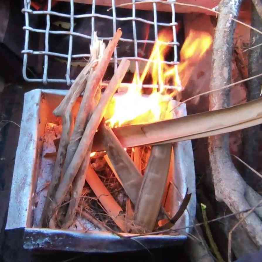 Собрал немного сухих, как мне казалось, дров, попробовал растопить подаренную мне печку. В качестве розжига использовал сухие листья кустарника. Комарьё сразу разбежалось, но дрова внутри оказались слишком мокрыми. Затея с костром на лодке провалилась. Ничего страшного, подымил – и то хорошо. Запарил фаринью (муку из маниока), вкусно.