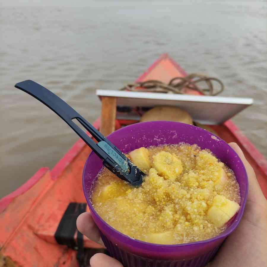 На обед поставил запариваться муку из маниока, которой я взял с собой килограммов 5 на случай, если с рыбой будет совсем тяжело. С виду напоминает кукурузную кашу, но куда легче размокает хоть в холодной, хоть в горячей воде. Это очень универсальный продукт. Радует, что она не требует разведения огня. Можно готовить прямо на ходу! С сахаром очень даже ничего.