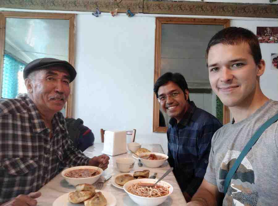 Спустя какое-то время, нам все-таки удалось поймать машину с семьей, что решила нам помочь выбраться на трассу, хотя им было совсем не по пути. Затем нас подобрал мужичок, что всю дорогу рассказывал о местной природе и своем внуке Нурсултане, что работает где-то в Жыргалане, мол, если увидите – передавайте привет. В конце своего пути он пригласил нас в местное кафе, чтобы угостить блюдами дунганской кухни, ключевым из которых стал ашлян-фу, острая лапша с кусочками крахмала. Постепенно нас окружили местные и даже попытались немного споить. Выглядело это как какой-то аттракцион, даже не знаю, кого было важнее напоить – индуса или русского, но мы стойко выдержали напор!