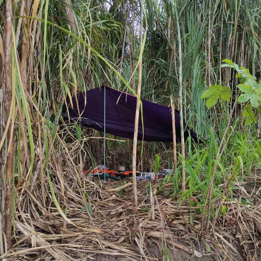Ежеминутно под тентом становится всё тяжелее дышать. Душно. Нужно скорее придумать конструкцию какого-нибудь каркаса, чтобы не повторять этот неприятный опыт.
