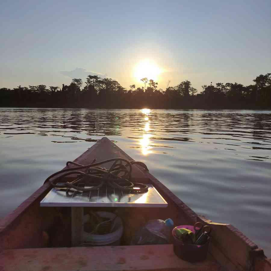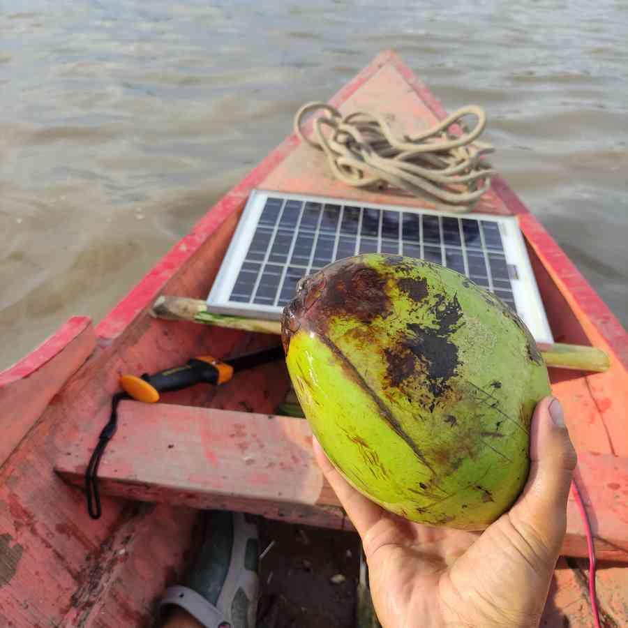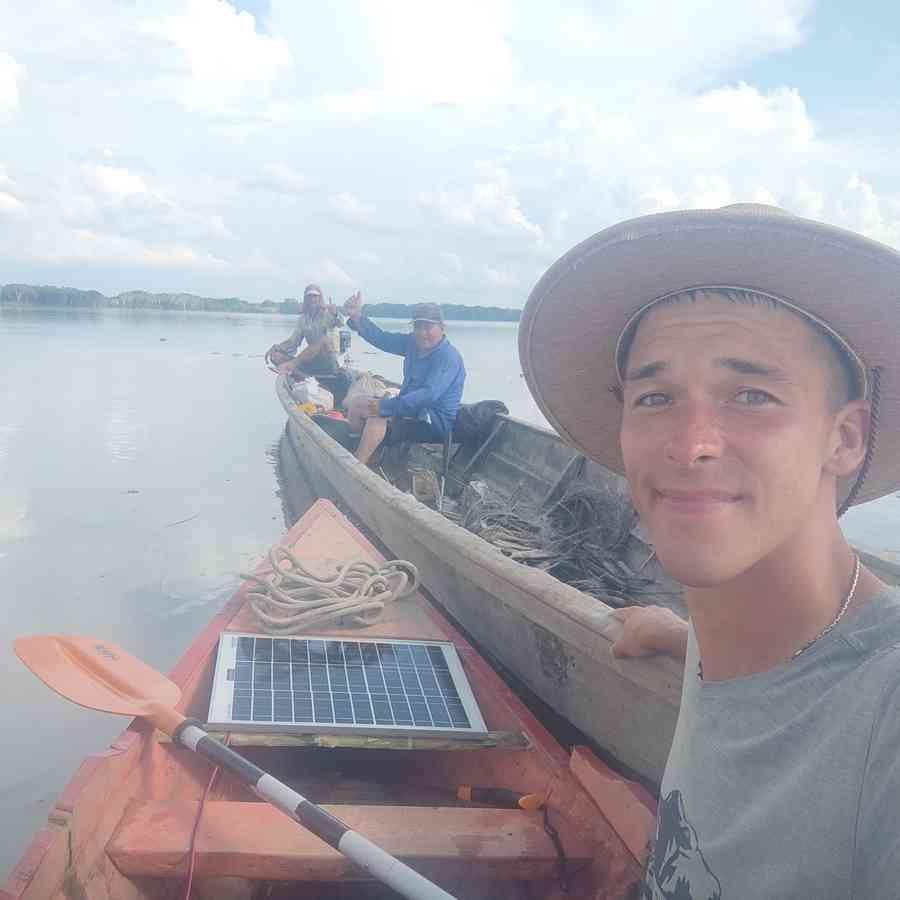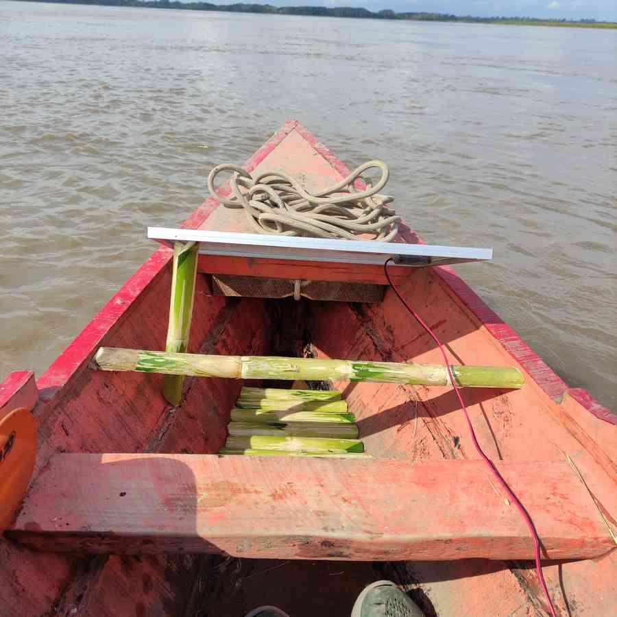 При помощи мачете сделал паз для установки солнечной панели на носу каноэ, теперь она как крышка закрывает отсек, при необходимости устанавливается под углом к солнцу. Её энергии хватает, чтобы заряжать телефон для съемок в пути (20W). Если пойдёт дождь, то вода по ней будет скатываться мимо сумки с припасами, что спрятана под ней, там же снасти.