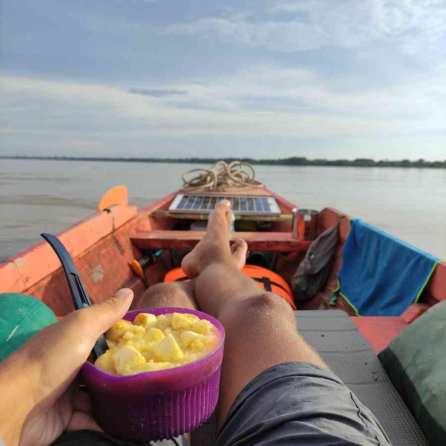 Кончилась вода. Все 8 литров, что я брал с собой. Посёлков на пути всё ещё нет, судя по всему, они спрятаны глубоко в лесу. Набрал воды из реки, отстоял, пропустил через полотенце в отдельную бутылку, потом через фильтр в другую (фильтр накручивается на горлышко бутылки). Так, надеюсь, удастся продлить ему жизнь. Фильтрация занимает много времени, но без воды никуда. Приготовил фаринью с амазонской водой. Если не будет диареи, один из ключевых вопросов будет снят с повестки выживания.