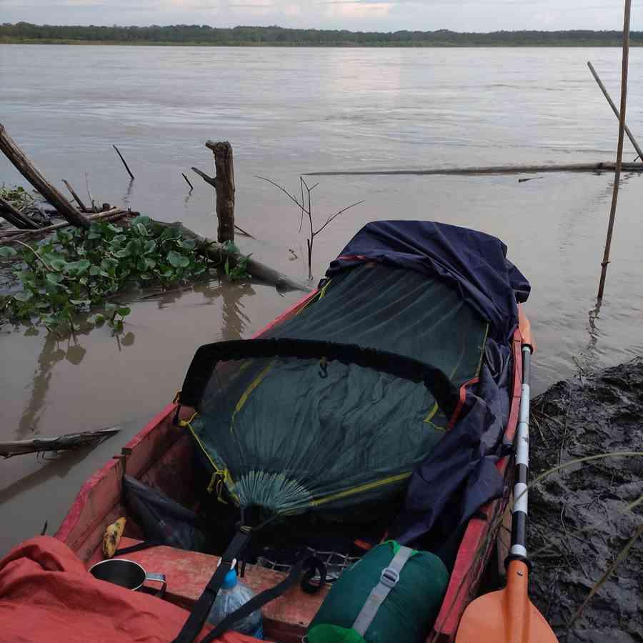 Удалось растянуть гамак чуть лучше, чем в прошлые ночи. С тентом же всё сложнее. Пошёл на хитрость. Воткнул под углом весло, чтобы на него навешать тент в случае дождя. Хоть что-то. Солнце почти зашло, но я решил соорудить донную снасть с бананом на крючке. Рыболовный азарт не отпускает. Никогда не знаешь, что сработает и когда, лучше лишний раз попробовать.