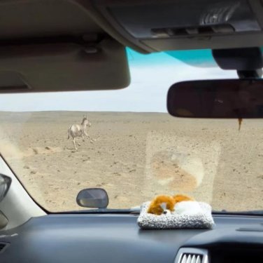 Миновав часть песчаной пустыни, видимость улучшается. Я вновь замечаю в полях верблюдов и ослов. Мункх указывает на последних и говорит "хулан!". Я переспрашиваю: изжиг? (осёл). Нет, хулан. Дикий осёл! Вот откуда они взялись. Выглядят точно так же, как обычные, но сильно светлее.