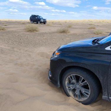 Сопровождавшая нас Тойота прошла очередную песчаную преграду без проблем, а мы на Лексусе застряли. Что он тут вообще забыл – непонятно. Пришлось как следует покопаться в песке и потолкать, чему я был несказанно рад – не зря меня взяли! Не проблема, а приключение, всё как я люблю.