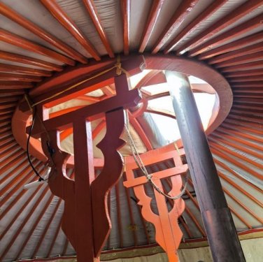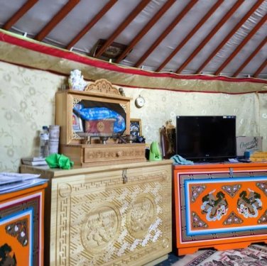 Юрта очень уютная и современная. Солнечная панель питает не только спутниковую тарелку и Wi-fi, но и морозилку! Готовят как на газу, так и на печи. Есть две кровати, несколько шкафов и отдельный уголок с буддистскими элементами – чаша, статуэтка и прочее. Меня усадили на кровать и налили соленого чая, дали хлеб, который нужно опускать в него. Потом достали большие ножницы и сказали, что сейчас пойдут стричь овец, не нужно ли и меня? Хе-хе.