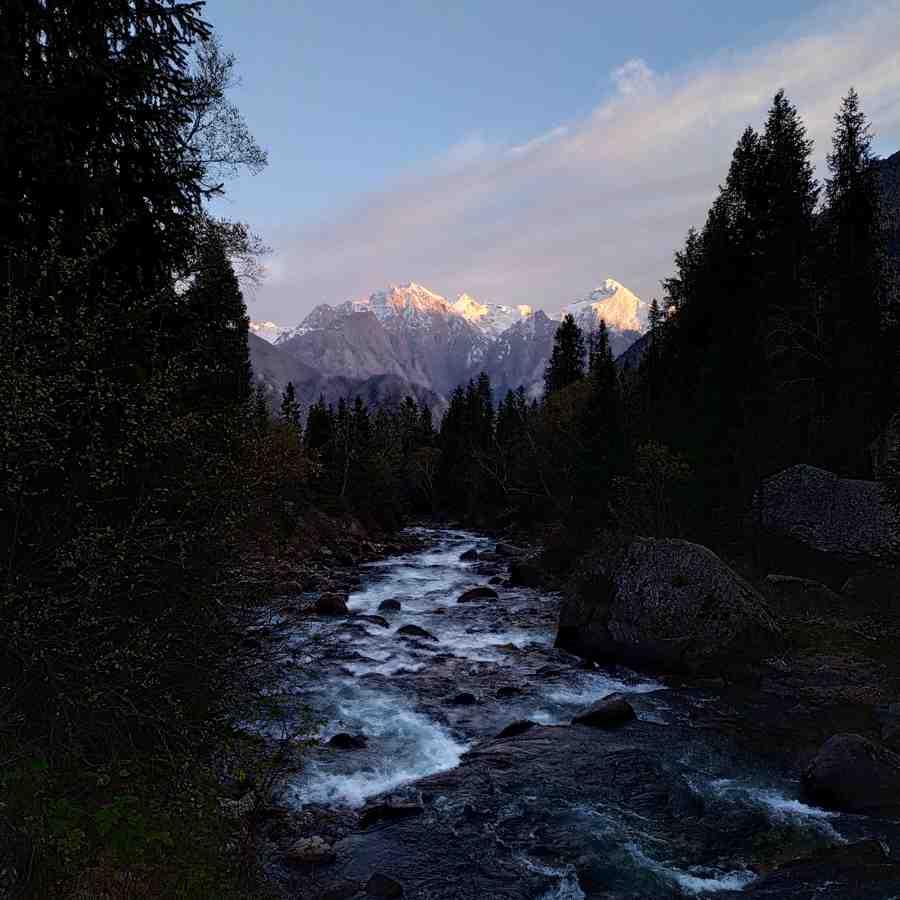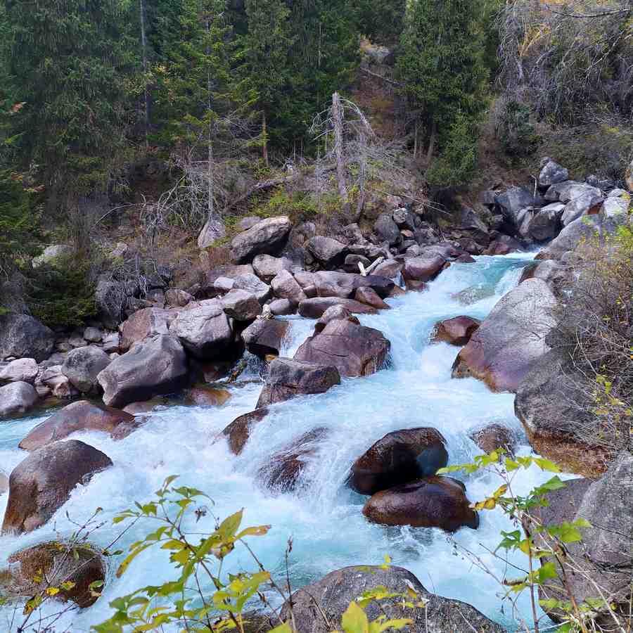 Альпийские луга, покрытые зеленью несмотря на позднюю осень, удивляли аккуратно высаженными елями, видно когда-то здесь планировали что-то построить, но так ничего и не удалось – может в этот момент и развалился СССР. Тропа вела меня все выше, пока я не поднялся достаточно высоко, чтобы увидеть белоснежные пики на горизонте, а чуть дальше – услышать ревущий грохот реки. Тропы к ней я не обнаружил, но это не могло помешать моему любопытству. Я решил проложить свой путь, напрямик. Резкий спуск, кустарники, что раздирают незащищенные от ветвей руки, валуны, преграждающие путь, разве это повод не следовать зову приключений? Не прошло и часа, как я все-таки увидел бирюзовый поток, что стремительно нес свои воды вниз по течению. Чистота и цвет воды, та мощь, с которой она неслась среди гигантских 5-7-метровых валунов, впечатляла. Палатку поставил неподалеку под сенью деревьев, где усталость взяла верх и я завалился внутрь ненадолго поспать.