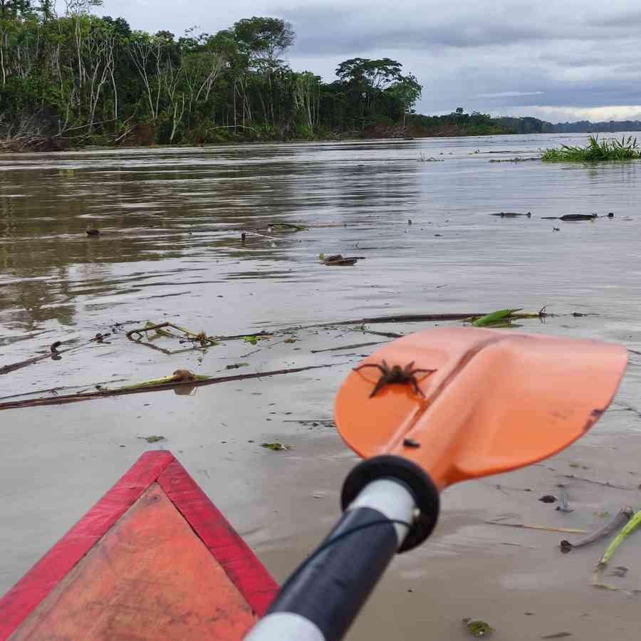 Практически каждый выход в туалет на берег выглядит как поиск сокровищ из фильма с Индиана Джонсом. Приходится прорубаться через джунгли и следить за тем, чтобы тебя кто-нибудь не укусил. Не говоря о том, что нужно выгрести с потока и отбиться от налетевших комаров. Спирали, кстати, работают прекрасно! Вчера они разогнали всех комаров. Те долгое время не подходили к лодке. Сейчас спирали спасли меня от тех, кто преследовал после высадки на берег. Но не от всех. Чёрные оводы всё так же терроризируют, при каждой возможности отрывая от меня кусочки плоти, попивая кровь.