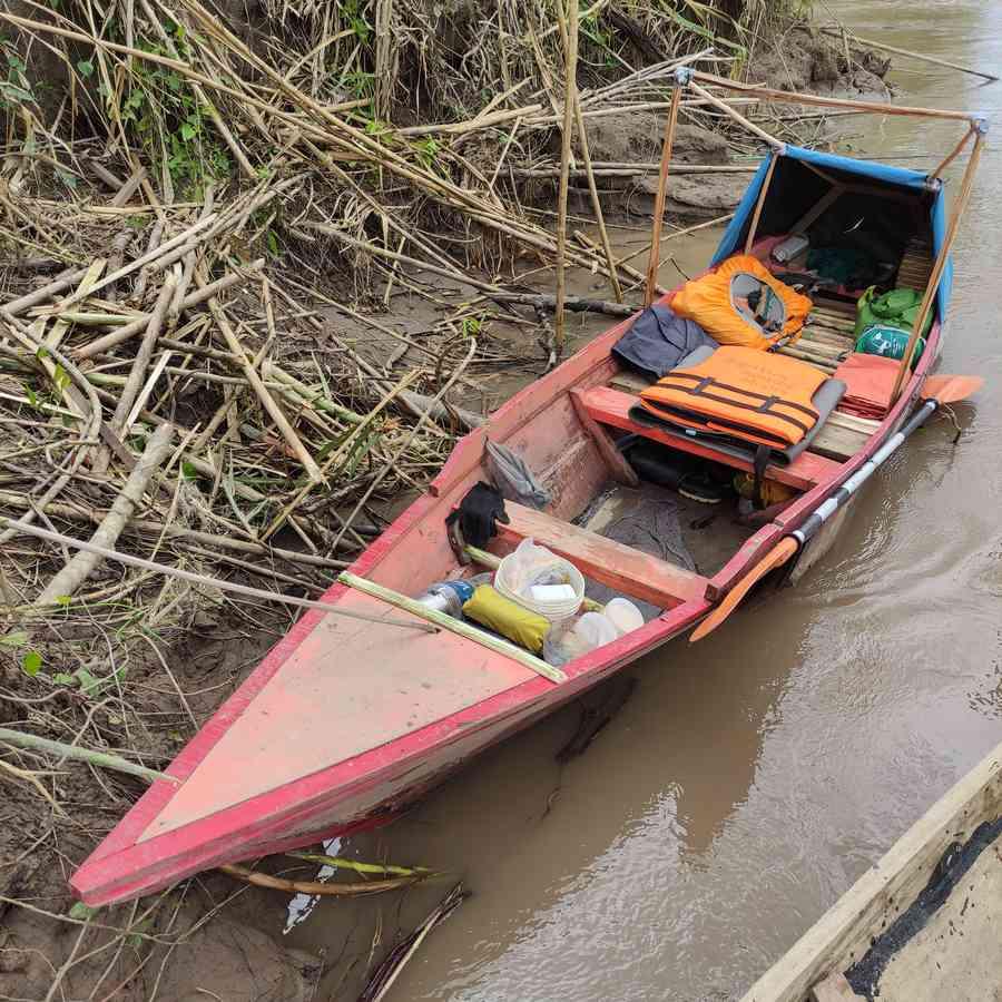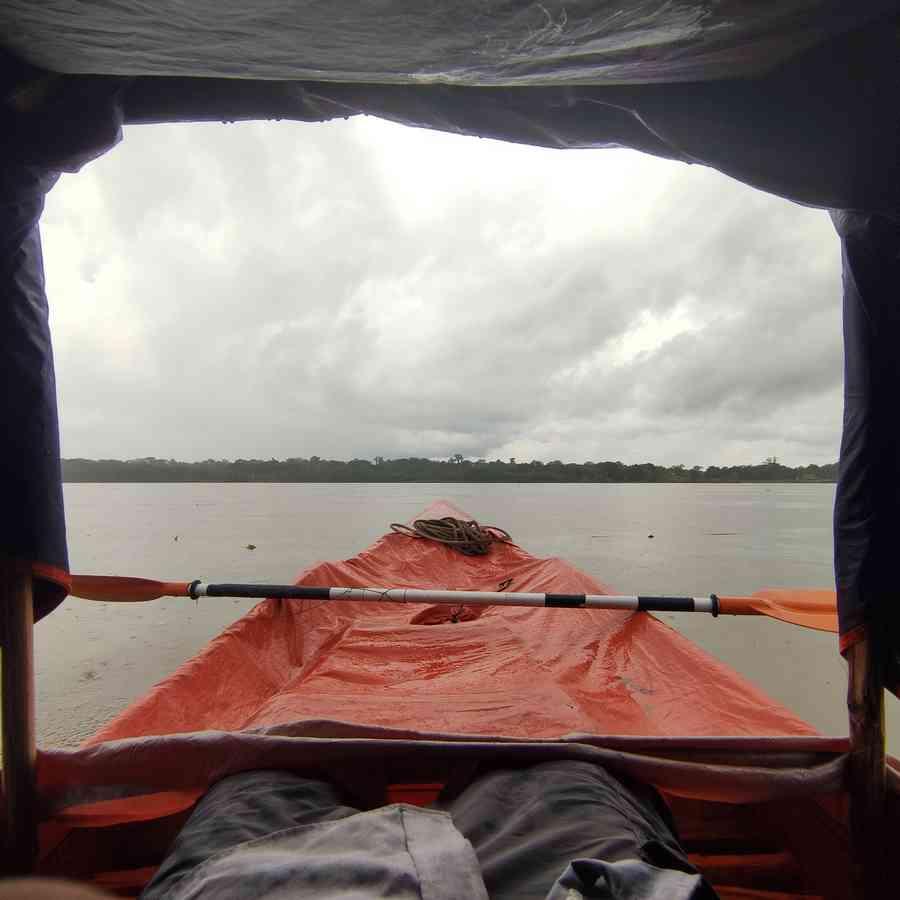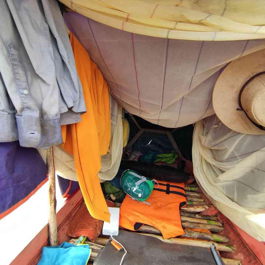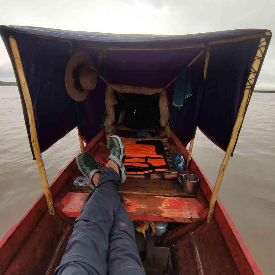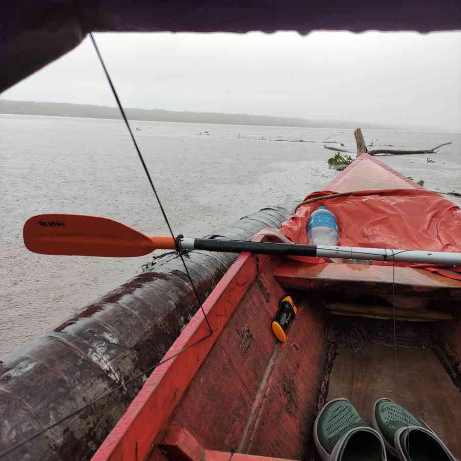 Решил пересесть на нос и погрести как местные, ради эксперимента. Действительно, так удаётся маневрировать куда быстрее, но у меня нет той скорости, которой жители могут достигать с мотором, чтобы так переживать о скорости поворота. Большую часть времени я отдаюсь течению, так что для меня важна не скорость лодки, а её комфортность. Да, какое-то каноэ могло бы развивать и 15 км/час, но разве на нём можно было бы спать? Решил перенести сидушку чуть вперёд, пойдя на компромисс: мне будет легче маневрировать, при этом я смогу удлинить крышу от дождя, вместе с кроватью.