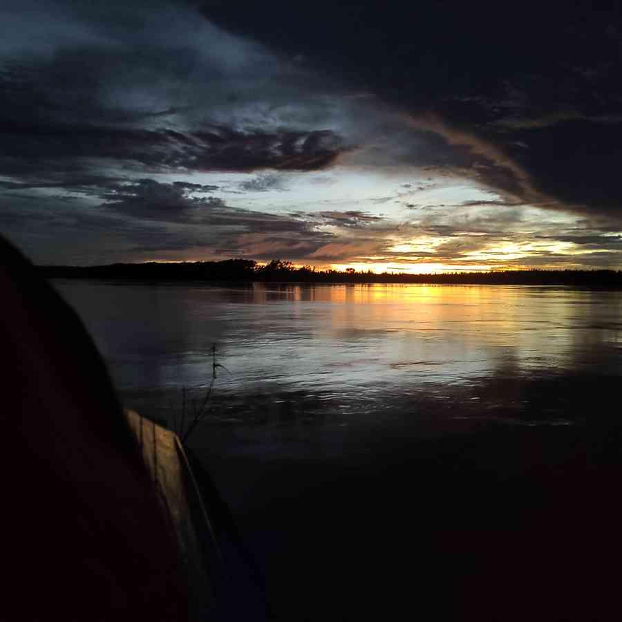 Приглядел уголок для стоянки. Не могу налюбоваться закатом. Мне так не хватало солнечного тепла. Целый день дождя определённо стоил того. Перед сном решил сделать пару забросов удочки с ягодкой на крючке. Результат не заставил себя ждать. Я поймал небольшого сома. Нацепил его на большой крючок, забросил в воду на течение, а капроновую нить привязал к ноге, чтобы в случае чего проснуться и подсечь добычу.