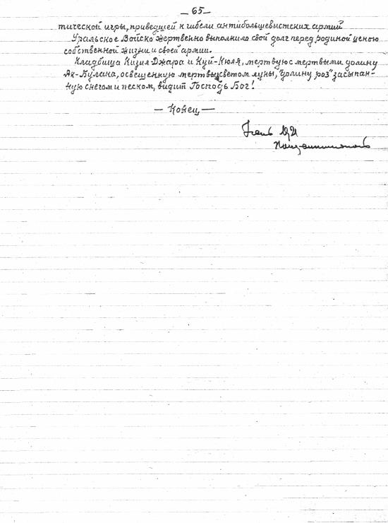 Отходом остатков разгромленной Уральской армии в Форт Александровский в феврале 1920 года полковник Изергин завершает свои воспоминания.