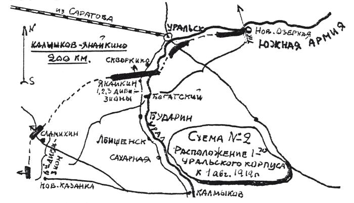 1-й Уральский корпус, удерживая сектор фронта к западу от реки Урал, к описываемому моменту главными своими силами занимал район к западу от станицы Янайкинской и саму Янайкинскую. Здесь была сосредоточена вся пехота корпуса: помимо уже упомянутого 1-го Уральского пехотного полка, Николаевский, Семёновский и Царевский партизанские отряды, Татарская рота, общей численности около 3 ]/г тысяч. Конниц: 1 – я дивизия полковника Кирилова, 2-я дивизия полковника Сладкова, 6-я дивизия полковника Бородина и, наконец, 3-я Илецкая дивизия, временно приданная корпусу полковника Щедрина[30]; 6-я дивизия полковника Бородина была расположена в районе Сламихинская – Новая Казинка, 200 вёрст к юго-западу от Янайкинской, имея задачей обеспечение направления со стороны Александровского Гая на Калмыков, направления, грозившего нашему главному пути сообщением с Гурьевым. Общая численность конницы – 8 16-9 тысяч. Броневой отряд в составе двух машин находился в Бударине, авиационный в Гурьеве.