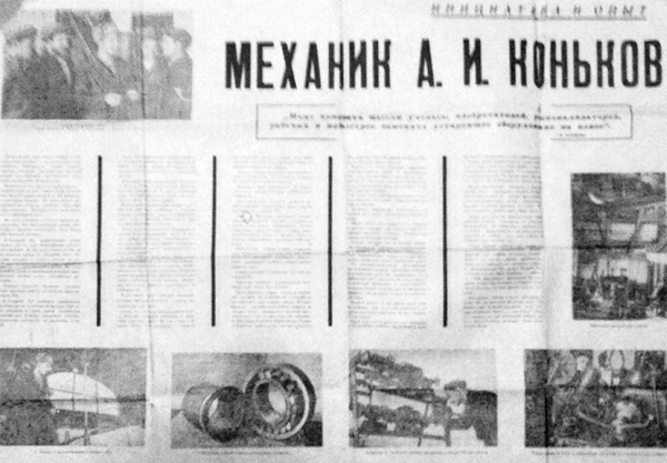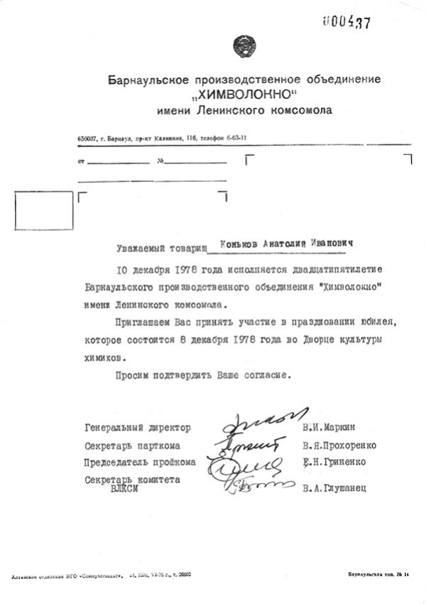 Разбирая семейный архив Конькова Анатолия Ивановича, я случайно наткнулся на две выцветшие, постаревшие от времени официальные бумаги – приглашения Барнаульского комбината химического волокна на юбилейные даты: двадцати- и двадцатипятилетие, которые меня буквально поразили своим вниманием. Прошло целых четырнадцать лет, уже дважды изменялось название организации, обновился состав руководства предприятия, а его всё помнят, чтят и хотят видеть среди самых дорогих и близких гостей. За какие особые заслуги его во второй раз приглашают служебным письмом принять участие в праздновании юбилея во Дворец культуры химиков; чем проявил себя этот молодой человек, какой героический подвиг совершил на объединении и в городе; за что оказывает ему рабочий коллектив такие почести – для меня всё больше и больше становится это трудной загадкой. А спустя какое-то время я нахожу ответы на эти вопросы. Среди кучи бумаг обращает на себя внимание огромный, ватманского размера, вчетверо сложенный лист, отпечатанный типографским способом с призывом к новаторам края развивать техническое творчество, с ярким заголовком: «Механик А. И. Коньков». В левом верхнем углу изображены люди, в центре которых стоит сам герой. Справа пониже напечатано мелким шрифтом высказывание Н. С. Хрущёва: «Надо признать мысли учёных, изобретателей, рационализаторов, рабочих и побыстрее заменять устаревшее оборудование на новое». А в центре в пяти колонках, обрамлённый деловыми фотографиями, следует текст, прочитав который становится всё понятно. Как 25-28-летний молодой специалист, комсомолец, впервые начав свою трудовую деятельность на этом заводе, так много для него сделал, усовершенствовал и внедрил ряд новшеств и оставил неизгладимый след как изобретатель и рационализатор.