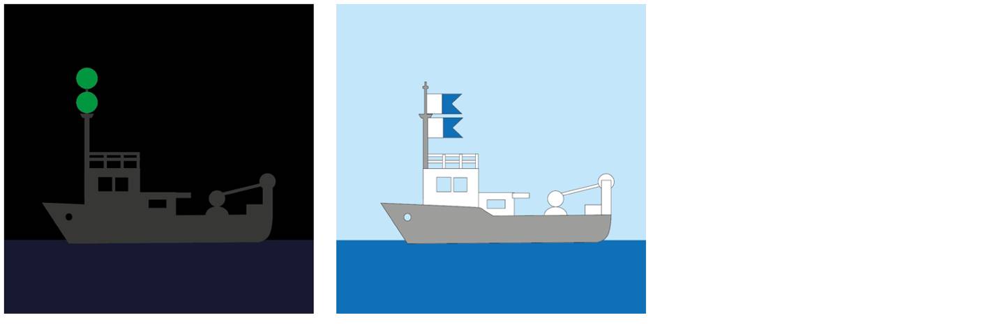 54. Судно, занятое водолазными работами, в темное время суток должно нести два зеленых круговых огня, расположенных по вертикальной линии, а в светлое время суток – два флага "А", расположенных по вертикальной линии один над другим.